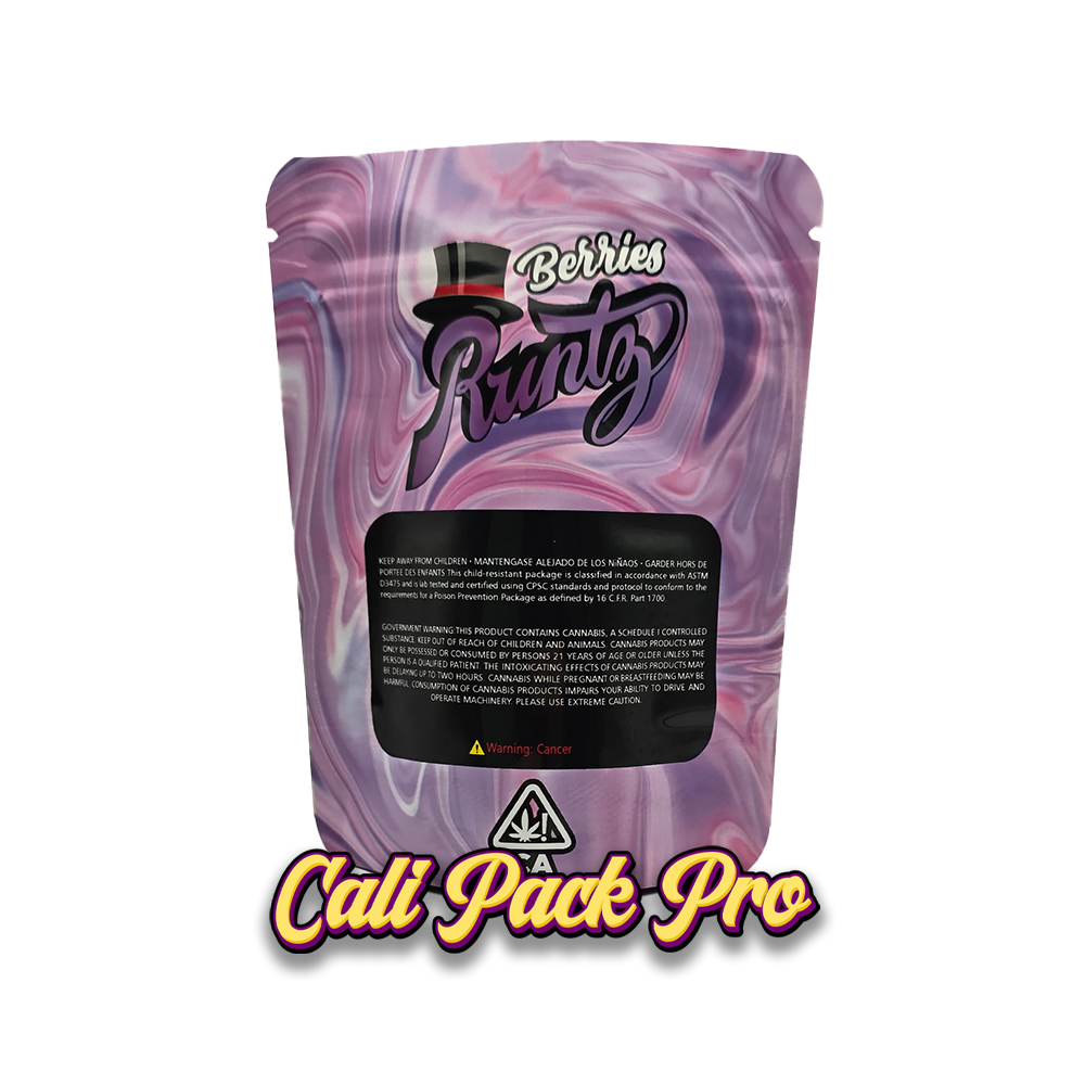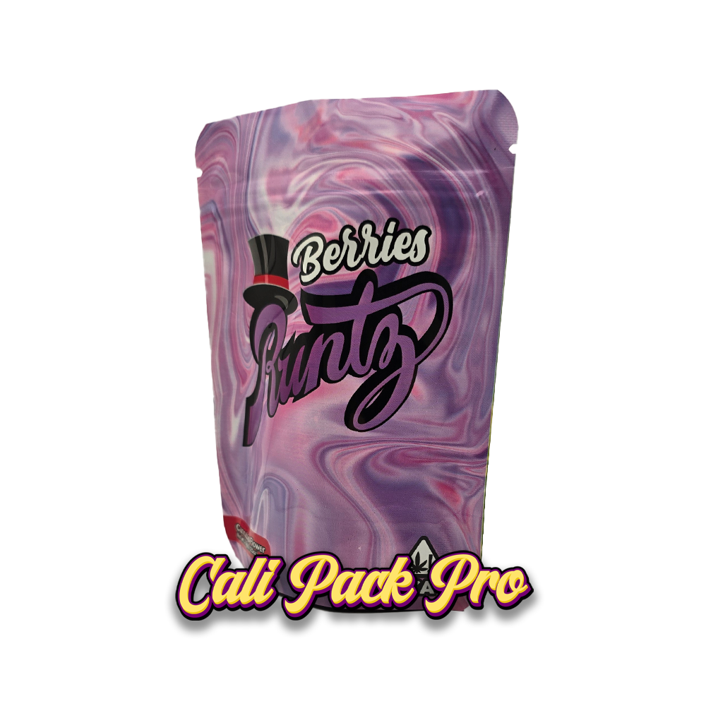Berries 3.5g Mylar Bag available in 1g, 3.5g, 7g, 14g, 28g, 112g, 224g, 448g, Food Grade PET + Aluminum, Glossy, Heat Seal + Zip Lock, Dry Herbs, Coffee, Edibles, Food Items.