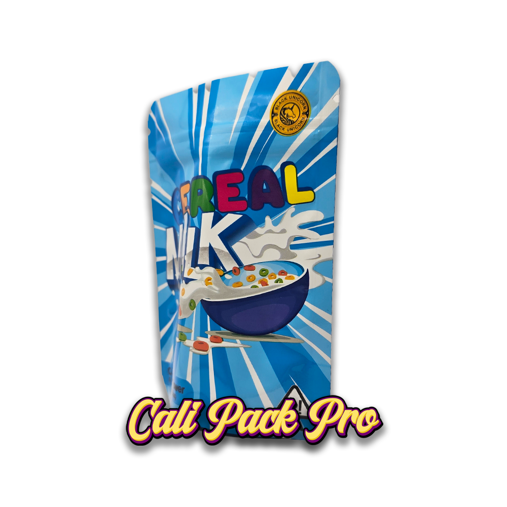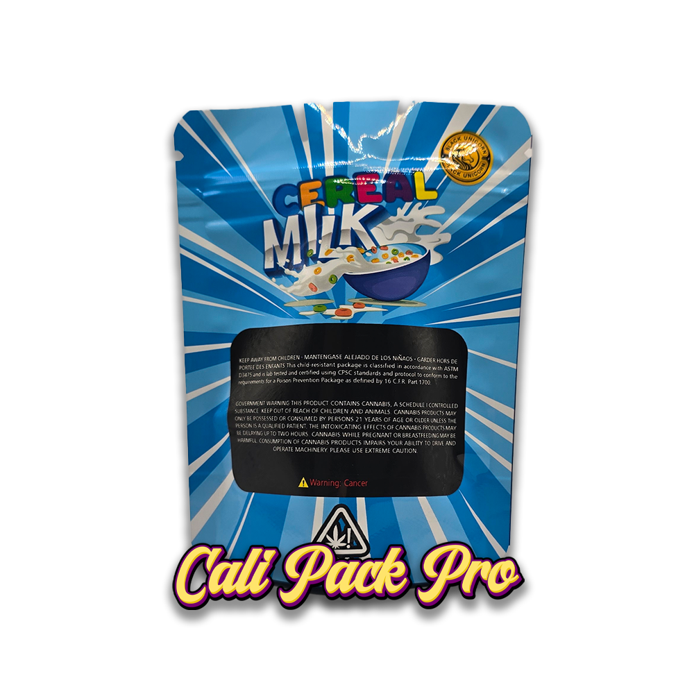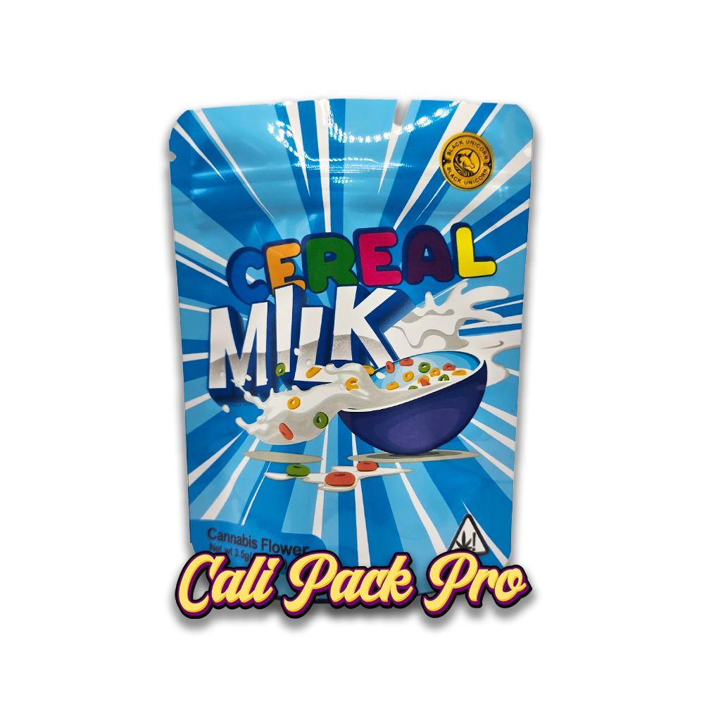 Cereal Milk 3.5g Mylar Bag available in 1g, 3.5g, 7g, 14g, 28g, 112g, 224g, 448g, Food Grade PET + Aluminum, Glossy, Heat Seal + Zip Lock, Dry Herbs, Coffee, Edibles, Food Items.