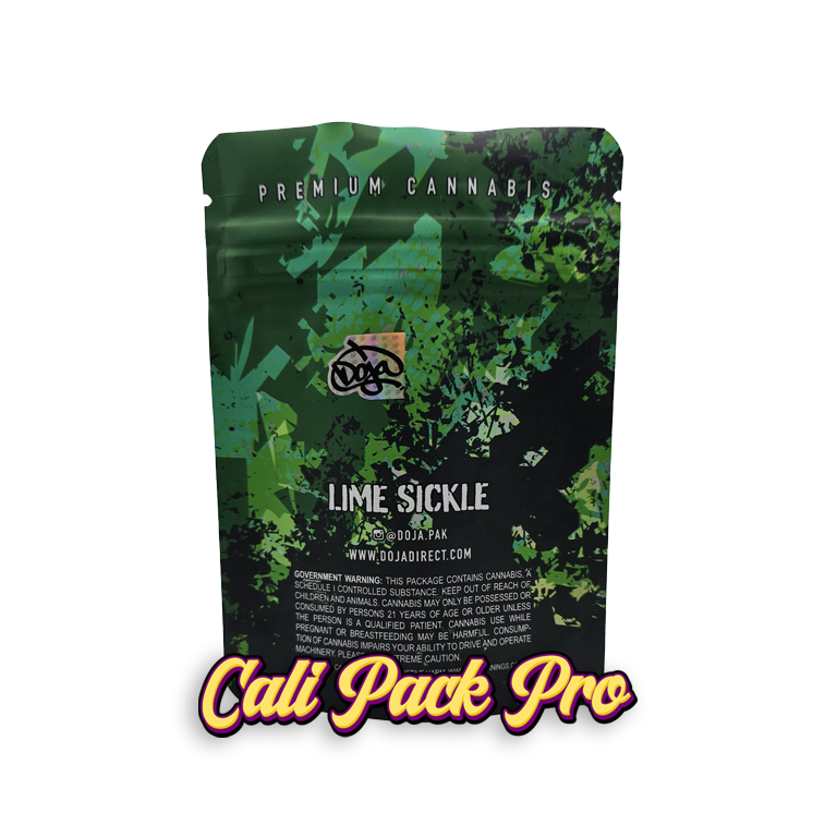 Doja Lime Sickle 3.5 Mylar Bag available in 1g, 3.5g, 7g, 14g, 28g, 112g, 224g, 448g, Food Grade PET + Aluminum, Glossy, Heat Seal + Zip Lock, Dry Herbs, Coffee, Edibles, Food Items.