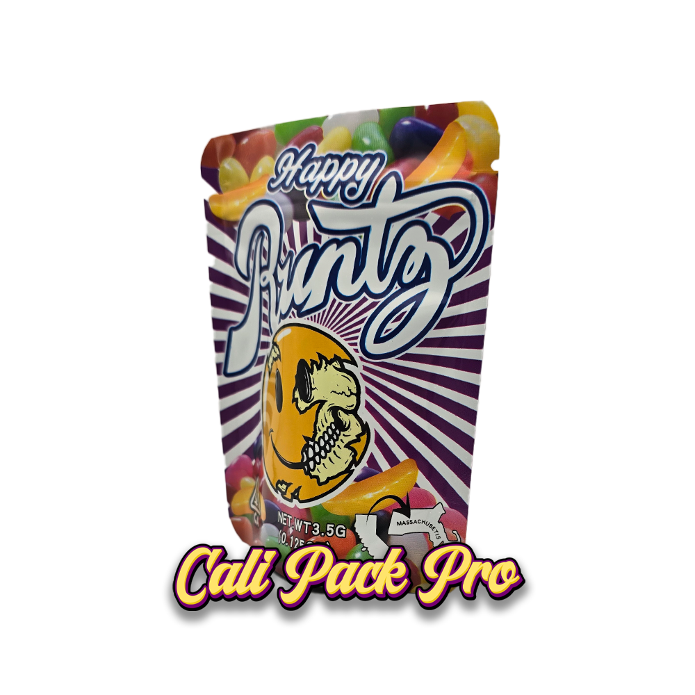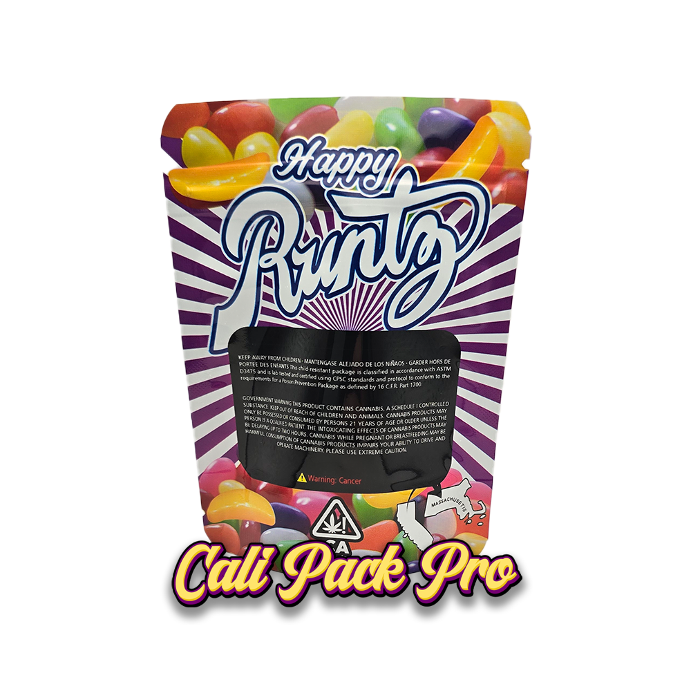 Happy Runtz 3.5g Mylar Bag available in 1g, 3.5g, 7g, 14g, 28g, 112g, 224g, 448g, Food Grade PET + Aluminum, Glossy, Heat Seal + Zip Lock, Dry Herbs, Coffee, Edibles, Food Items.