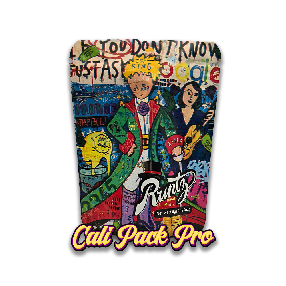 King Runtz 3.5g Mylar Bag available in 1g, 3.5g, 7g, 14g, 28g, 112g, 224g, 448g, Food Grade PET + Aluminum, Glossy, Heat Seal + Zip Lock, Dry Herbs, Coffee, Edibles, Food Items.