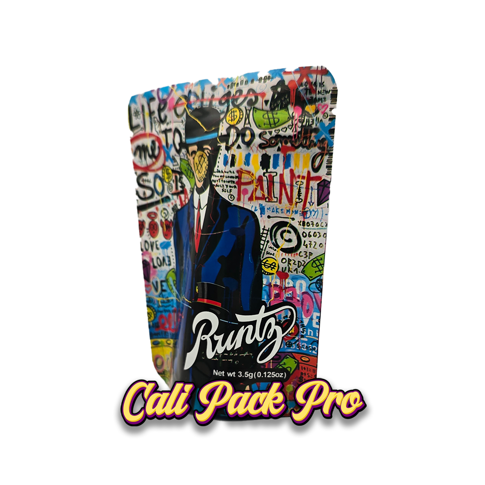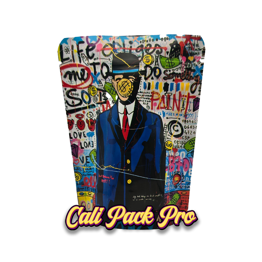 Money Man 3.5g Mylar Bag available in 1g, 3.5g, 7g, 14g, 28g, 112g, 224g, 448g, Food Grade PET + Aluminum, Glossy, Heat Seal + Zip Lock, Dry Herbs, Coffee, Edibles, Food Items.