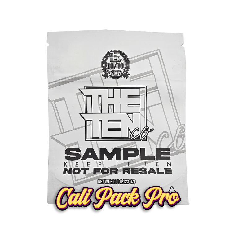 The Ten Co Sample Bag available in 1g, 3.5g, 7g, 14g, 28g, 112g, 224g, 448g, Food Grade PET + Aluminum, Glossy, Heat Seal + Zip Lock, Dry Herbs, Coffee, Edibles, Food Items.