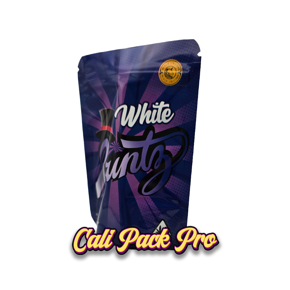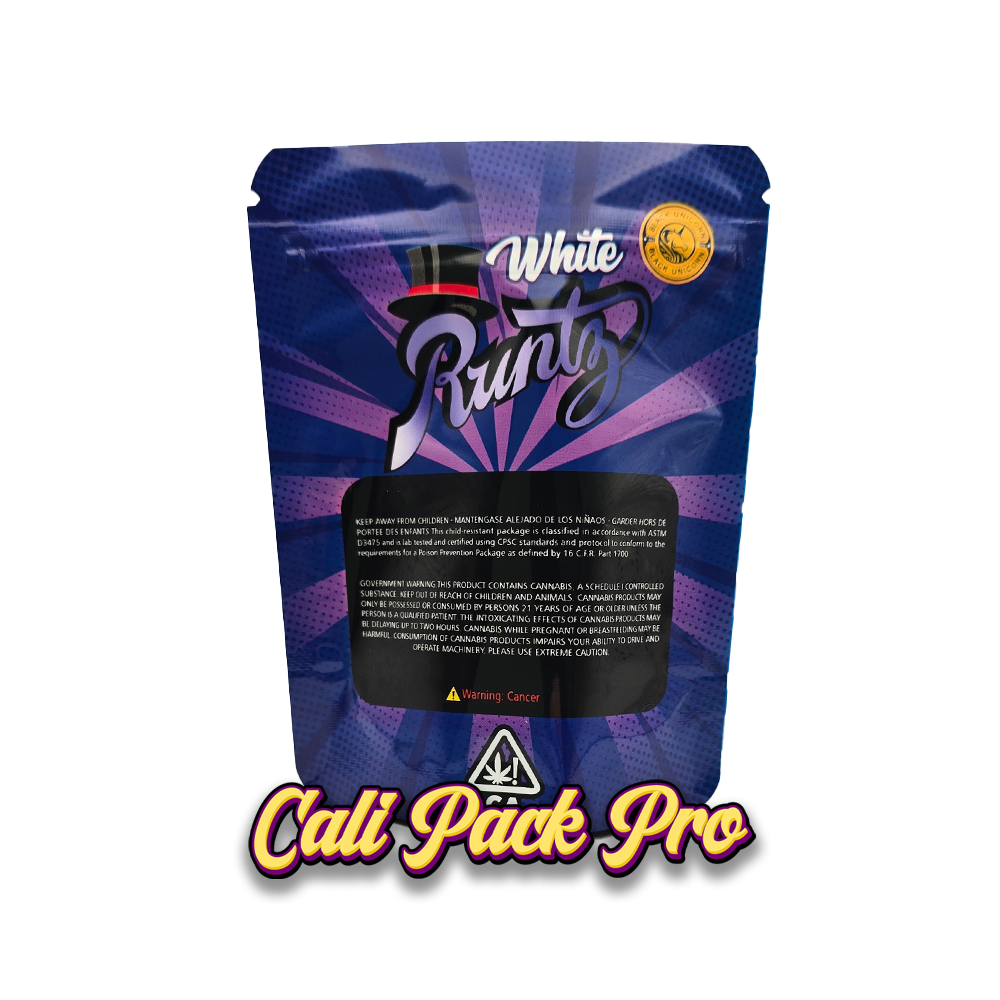 White Runtz 3.5g Mylar Bag available in 1g, 3.5g, 7g, 14g, 28g, 112g, 224g, 448g, Food Grade PET + Aluminum, Glossy, Heat Seal + Zip Lock, Dry Herbs, Coffee, Edibles, Food Items.
